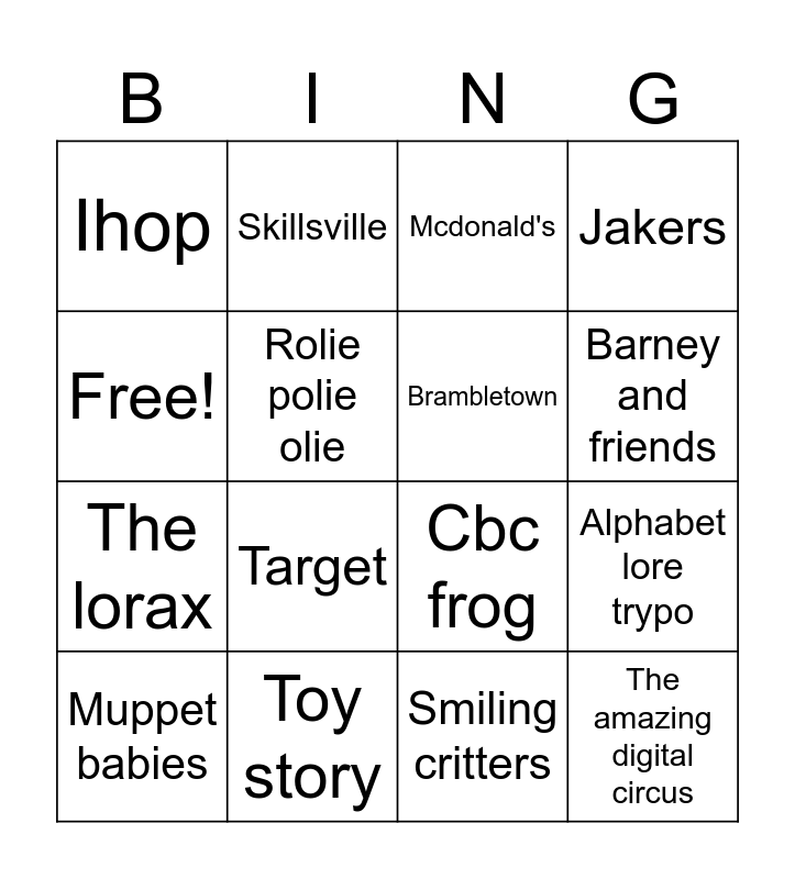 This bingo card has 16 words: Toy story, Alphabet lore trypo, Mcdonald's, Ihop, The lorax, Skillsville, Cbc frog, Smiling critters, Free!, Rolie polie olie, Muppet babies, Jakers, Target, Barney and friends, Brambletown and The amazing digital circus.