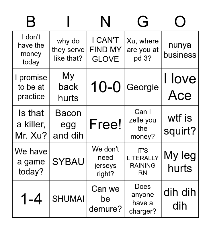 This bingo card has a free space and 24 words: SYBAU, SHUMAI, 10-0, 1-4, nunya business, I don't have the money today, I promise to be at practice, why do they serve like that?, Can I zelle you the money?, We don't need jerseys right?, Georgie, Is that a killer, Mr. Xu?, IT'S LITERALLY RAINING RN, My leg hurts, My back hurts, Does anyone have a charger?, wtf is squirt?, I CAN'T FIND MY GLOVE, I love Ace, Bacon egg and dih, dih dih dih, We have a game today?, Xu, where are you at pd 3? and Can we be demure?.