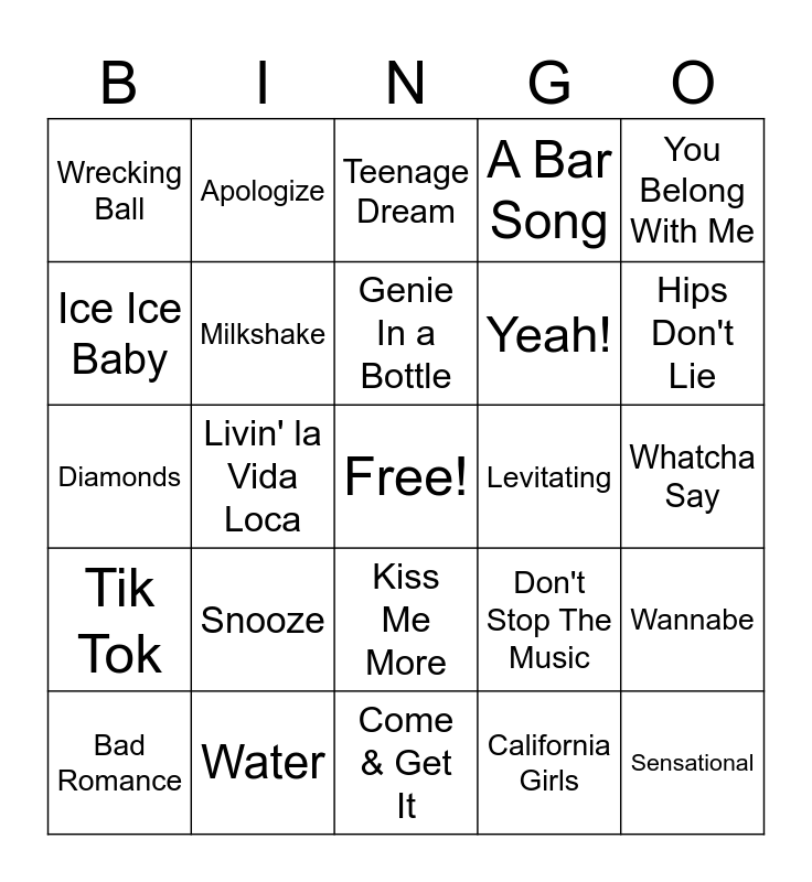 This bingo card has a free space and 45 words: Nokia, Sensational, Oops!...I Did It Again, Bad Romance, Texas Hold 'Em, California Girls, Teenage Dream, Espresso, You Belong With Me, Water, A Bar Song, Levitating, Kiss Me More, Snooze, Baby, Come & Get It, Umbrella, Diamonds, Counting Stars, Hips Don't Lie, Apologize, Low, A Thousand Miles, Wrecking Ball, Complicated, Whatcha Say, Say My Name, SexyBack, Don't Stop The Music, Tik Tok, The Sweet Escape, Wannabe, Barbie Girl, I Want It That Way, Timber, Livin' la Vida Loca, I Wanna Dance with Somebody, Dancing Queen, Girl on Fire, Genie In a Bottle, Ice Ice Baby, Yeah!, Unwritten, Milkshake and Y.M.C.A..