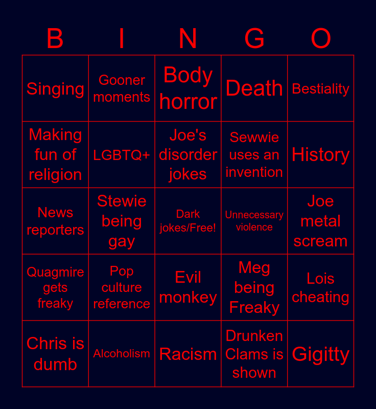 This bingo card has a free space and 48 words: Herbert, Gigitty, Peter laugh, Racism, Pop culture reference, Brian and stewie, Gooner moments, Cutaway gag, Making fun of religion, Stereotypes, LGBTQ+, Death, Lois cheating, Meg being Freaky, Celebrity Roasting, Stewie tries to kill Lois, Joe's disorder jokes, Unnecessary violence, Chicken VS Peter, Bestiality, Stewie being gay, Drunken Clams is shown, Singing, Sewwie uses an invention, SWEET HOME ALABAMA, History, Chris is dumb, Homophobia, Evil monkey, Quagmire gets freaky, Stewie disses Brian, Fascism jokes, Mayor Adam West, Fourth wall break, Alcoholism, Brian gets hurt, Meg disrespect, Joe metal scream, Drugs, Kool Aid man, Noooooo, Peter is stupid, Body horror, Pregnancy, News reporters, I miss all of this, Incest and Brian in love.