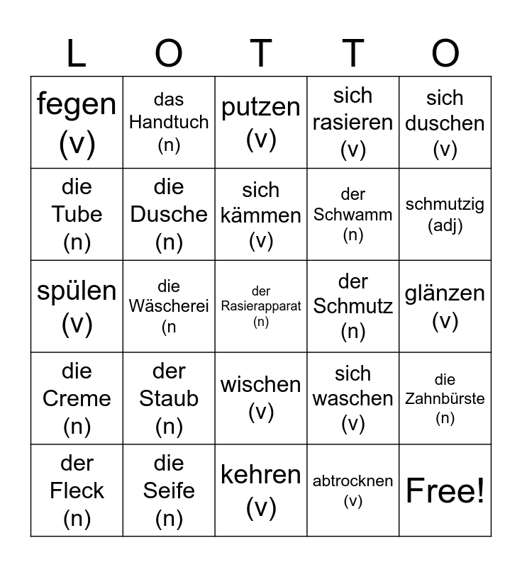 This bingo card has 34 words: Free!, abtrocknen (v), das Bad (n), die Bürste (n), die Creme (n), die Dusche (n), sich duschen (v), der Fleck (n), das Handtuch (n), der Kamm (n), sich kämmen (v), putzen (v), reinigen (v), sauber (adj), der Schmutz (n), schmutzig (adj), die Seife (n), spülen (v), der Staub (n), sich waschen (v), wischen (v), sich baden (v), fegen (v), glänzen (v), kehren (v), der Rasierapparat (n), sich rasieren (v), die Rasierklinge (n), der Schwamm (n), die Tube (n), die Waschmaschine (n), die Wäscherei (n, die Zahnbürste (n) and die Zahnpasta (n).