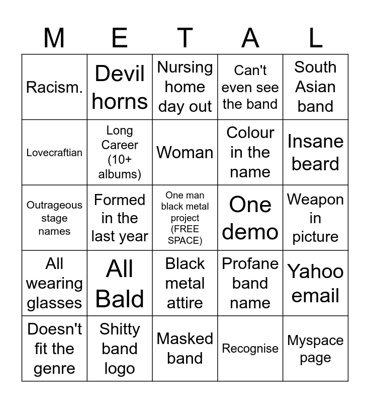 This bingo card has a free space and 24 words: All Bald, Shitty band logo, Woman, Doesn't fit the genre, South Asian band, Racism., Lovecraftian, Devil horns, One demo, Black metal attire, Colour in the name, Outrageous stage names, Profane band name, Yahoo email, Long Career (10+ albums), Recognise, Weapon in picture, Nursing home day out, Insane beard, Formed in the last year, Myspace page, All wearing glasses, Can't even see the band and Masked band.