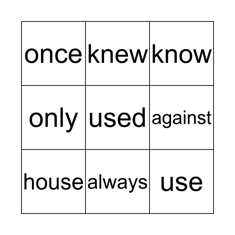 This bingo card has 12 words: sure, use, used, against, knew, know, always, often, once, only, house and move.