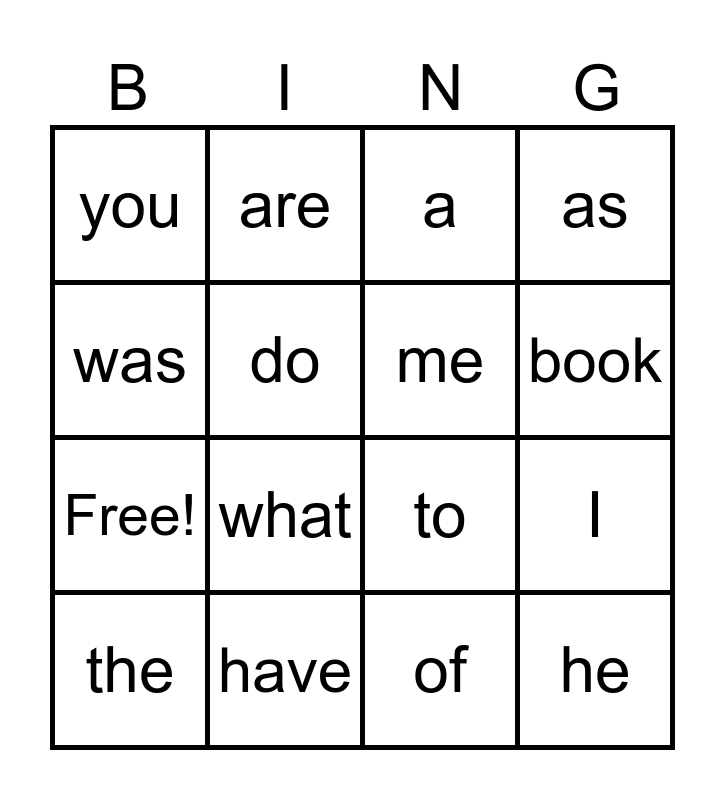 This bingo card has 20 words: I, is, a, said, the, was, have, you, Free!, are, what, to, do, he, me, look, book, as, of and and.