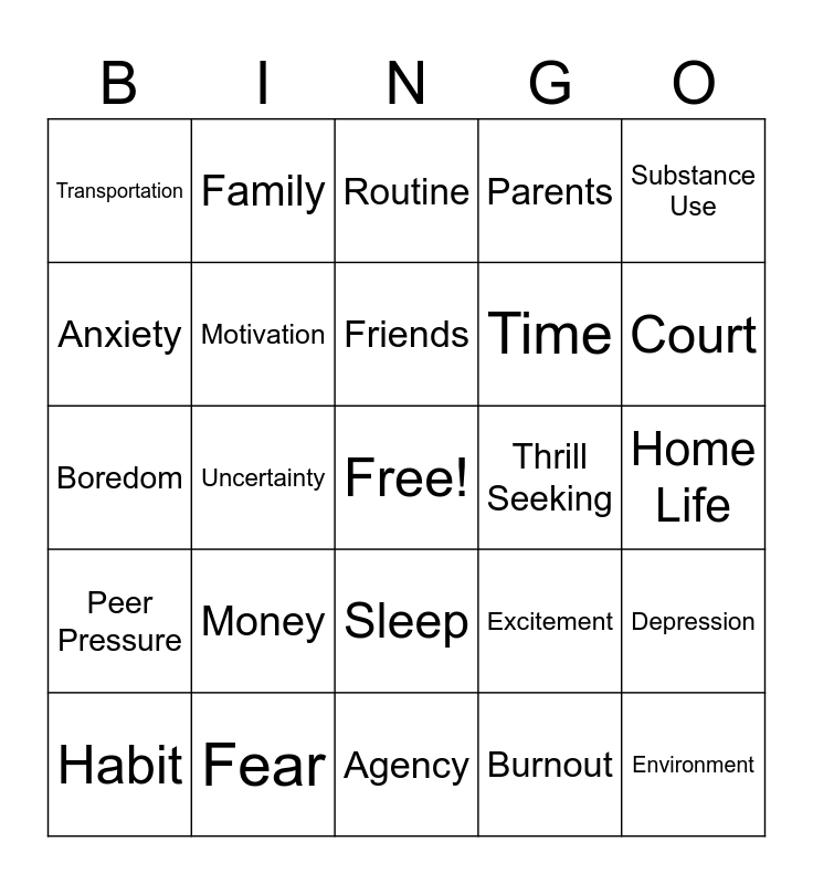 This bingo card has a free space and 24 words: Money, Fear, Friends, Habit, Substance Use, Transportation, Anxiety, Family, Thrill Seeking, Sleep, Time, Boredom, Excitement, Depression, Motivation, Burnout, Home Life, Routine, Court, Uncertainty, Environment, Peer Pressure, Parents and Agency.