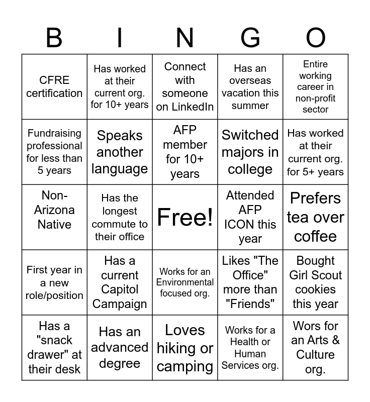 This bingo card has a free space and 24 words: Has a current Capitol Campaign, Has an advanced degree, AFP member for 10+ years, Has a "snack drawer" at their desk, Entire working career in non-profit sector, CFRE certification, Fundraising professional for less than 5 years, Has worked at their current org. for 10+ years, Attended AFP ICON this year, Works for an Environmental focused org., Switched majors in college, Non-Arizona Native, Likes "The Office" more than "Friends", Bought Girl Scout cookies this year, Speaks another language, Works for a Health or Human Services org., Prefers tea over coffee, Connect with someone on LinkedIn, Has worked at their current org. for 5+ years, Has the longest commute to their office, Wors for an Arts & Culture org., First year in a new role/position, Has an overseas vacation this summer and Loves hiking or camping.