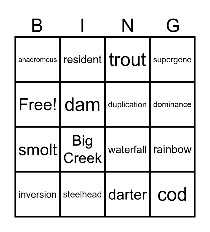 This bingo card has 16 words: steelhead, rainbow, trout, anadromous, smolt, resident, waterfall, darter, Free!, dam, inversion, supergene, Big Creek, dominance, duplication and cod.