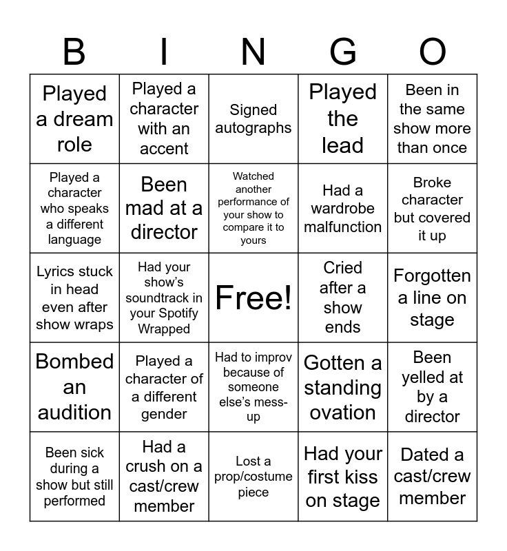 This bingo card has a free space and 24 words: Been sick during a show but still performed, Played a character of a different gender, Watched another performance of your show to compare it to yours, Had your first kiss on stage, Been in the same show more than once, Played a dream role, Played a character with an accent, Signed autographs, Cried after a show ends, Forgotten a line on stage, Lyrics stuck in head even after show wraps, Been mad at a director, Gotten a standing ovation, Been yelled at by a director, Played a character who speaks a different language, Had a crush on a cast/crew member, Lost a prop/costume piece, Played the lead, Broke character but covered it up, Bombed an audition, Had your show’s soundtrack in your Spotify Wrapped, Had to improv because of someone else’s mess-up, Had a wardrobe malfunction and Dated a cast/crew member.