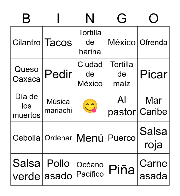 This bingo card has a free space and 24 words: Ordenar, Pollo asado, Ciudad de México, Salsa verde, Ofrenda, Cilantro, Queso Oaxaca, Tacos, Al pastor, Menú, Tortilla de maíz, Día de los muertos, Puerco, Salsa roja, Pedir, Piña, Mar Caribe, Tortilla de harina, Picar, Música mariachi, Carne asada, Cebolla, México and Océano Pacífico.