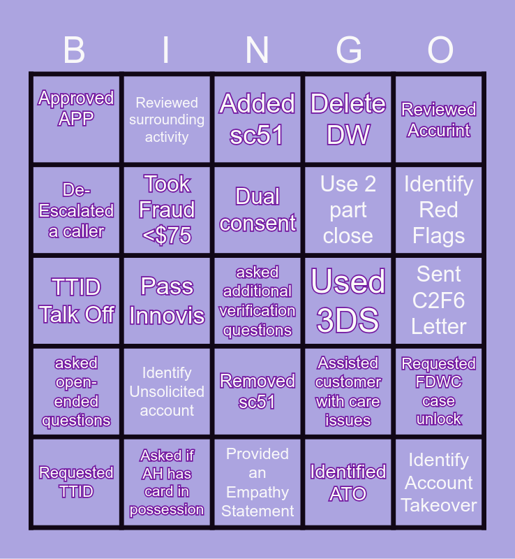 This bingo card has 35 words: Declined App, Frd Report >$75, Called Case/Email AP bilingual, Took Fraud <$75, Removed sc51, Delete DW, De-Escalated a caller, Failed Innovis, Dual consent, Executed FDWC, TTID Talk Off, Reviewed Accurint, Free!, Sent AUD, Approved APP, Used 3DS, Identified ATO, Pass Innovis, asked open-ended questions, asked additional verification questions, Assisted customer with care issues, Requested TTID, Requested FDWC case unlock, Asked if AH has card in possession, Added sc51, Identify Red Flags, Identify Account Takeover, Identify Spoofing Call, Use 2 part close, Sent C2F6 Letter, Has a Withdrawal of Fraud, Provided an Empathy Statement, Identify Unsolicited account, Reviewed surrounding activity and Branded call.