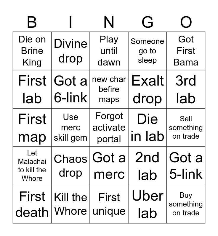 This bingo card has 25 words: Chaos drop, First unique, new char befire maps, First death, Got First Bama, Die on Brine King, First lab, Divine drop, Die in lab, Got a merc, Exalt drop, First map, 2nd lab, Got a 5-link, Got a 6-link, Buy something on trade, Sell something on trade, Play until dawn, 3rd lab, Use merc skill gem, Forgot activate portal, Kill the Whore, Let Malachai to kill the Whore, Someone go to sleep and Uber lab.