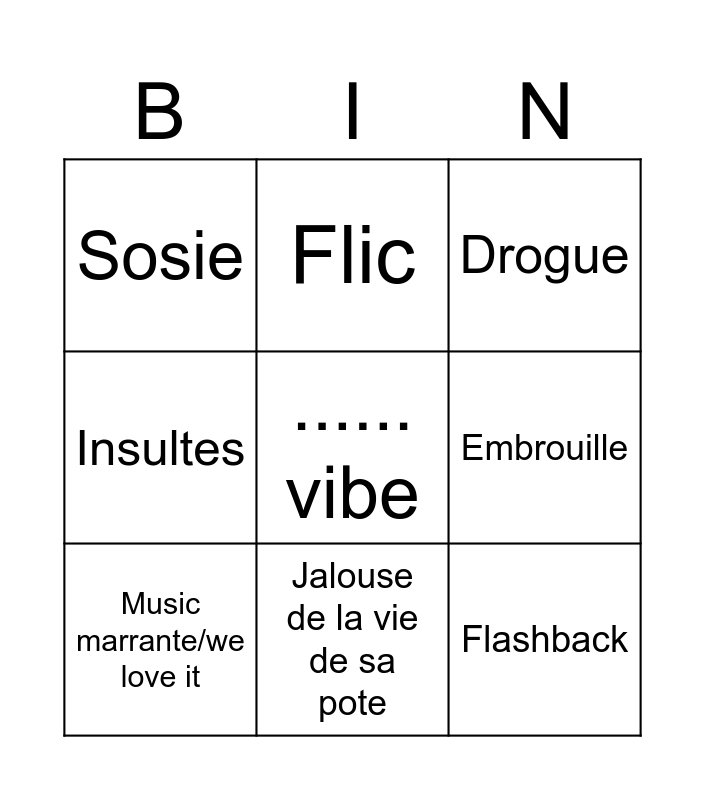 This bingo card has a free space and 8 words: Embrouille, Drogue, Flic, Music marrante/we love it, Sosie, Flashback, Insultes and Jalouse de la vie de sa pote.