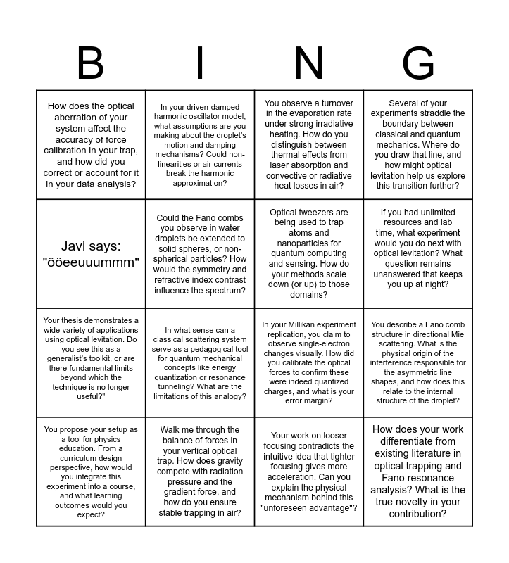 This bingo card has 16 words: Walk me through the balance of forces in your vertical optical trap. How does gravity compete with radiation pressure and the gradient force, and how do you ensure stable trapping in air?, You describe a Fano comb structure in directional Mie scattering. What is the physical origin of the interference responsible for the asymmetric line shapes, and how does this relate to the internal structure of the droplet?, You observe a turnover in the evaporation rate under strong irradiative heating. How do you distinguish between thermal effects from laser absorption and convective or radiative heat losses in air?, How does the optical aberration of your system affect the accuracy of force calibration in your trap, and how did you correct or account for it in your data analysis?, Your thesis demonstrates a wide variety of applications using optical levitation. Do you see this as a generalist’s toolkit, or are there fundamental limits beyond which the technique is no longer useful?", In your driven-damped harmonic oscillator model, what assumptions are you making about the droplet’s motion and damping mechanisms? Could non-linearities or air currents break the harmonic approximation?, In your Millikan experiment replication, you claim to observe single-electron changes visually. How did you calibrate the optical forces to confirm these were indeed quantized charges, and what is your error margin?, Your work on looser focusing contradicts the intuitive idea that tighter focusing gives more acceleration. Can you explain the physical mechanism behind this "unforeseen advantage"?, Javi says: "ööeeuuummm", Could the Fano combs you observe in water droplets be extended to solid spheres, or non-spherical particles? How would the symmetry and refractive index contrast influence the spectrum?, You propose your setup as a tool for physics education. From a curriculum design perspective, how would you integrate this experiment into a course, and what learning outcomes would you expect?, Several of your experiments straddle the boundary between classical and quantum mechanics. Where do you draw that line, and how might optical levitation help us explore this transition further?, In what sense can a classical scattering system serve as a pedagogical tool for quantum mechanical concepts like energy quantization or resonance tunneling? What are the limitations of this analogy?, If you had unlimited resources and lab time, what experiment would you do next with optical levitation? What question remains unanswered that keeps you up at night?, Optical tweezers are being used to trap atoms and nanoparticles for quantum computing and sensing. How do your methods scale down (or up) to those domains? and How does your work differentiate from existing literature in optical trapping and Fano resonance analysis? What is the true novelty in your contribution?.