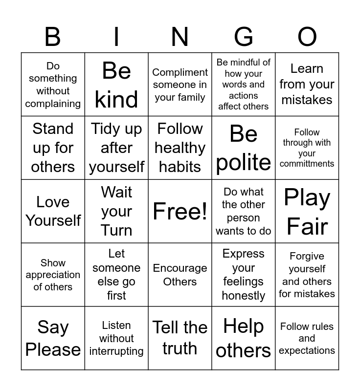 This bingo card has a free space and 29 words: Say Please, Say Thank You, Wait your Turn, Do something the first time asked, Do something without complaining, Compliment someone in your family, Tidy up after yourself, Let someone else go first, Do what the other person wants to do, Listen without interrupting, Play Fair, Follow rules and expectations, Tell the truth, Help others, Follow through with your committments, Accept No as an answer, Encourage Others, Show appreciation of others, Learn from your mistakes, Love Yourself, Express your feelings honestly, Manage your emotions, Be polite, Stand up for others, Be mindful of how your words and actions affect others, Be kind, Forgive yourself and others for mistakes, Follow healthy habits and Accept your flaws.