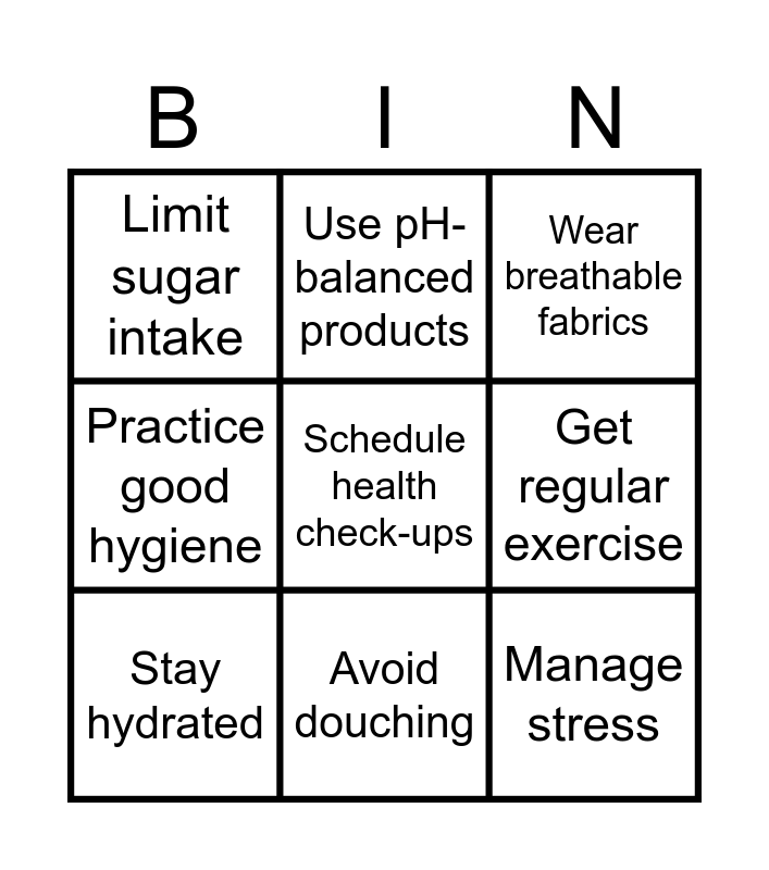 This bingo card has 9 words: Stay hydrated, Wear breathable fabrics, Use pH-balanced products, Practice good hygiene, Limit sugar intake, Get regular exercise, Schedule health check-ups, Manage stress and Avoid douching.