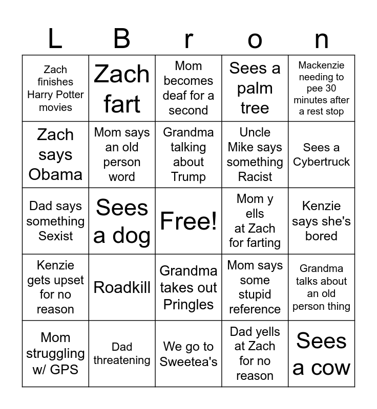 This bingo card has a free space and 24 words: Roadkill, Dad threatening, Grandma talking about Trump, Mom struggling w/ GPS, Mackenzie needing to pee 30 minutes after a rest stop, Zach finishes Harry Potter movies, Zach says Obama, Zach fart, Mom yells at Zach for farting, Grandma takes out Pringles, Uncle Mike says something Racist, Dad says something Sexist, Mom says some stupid reference, Grandma talks about an old person thing, Mom says an old person word, Dad yells at Zach for no reason, Kenzie says she's bored, Mom becomes deaf for a second, Sees a Cybertruck, Sees a dog, Sees a cow, Kenzie gets upset for no reason, Sees a palm tree and We go to Sweetea's.