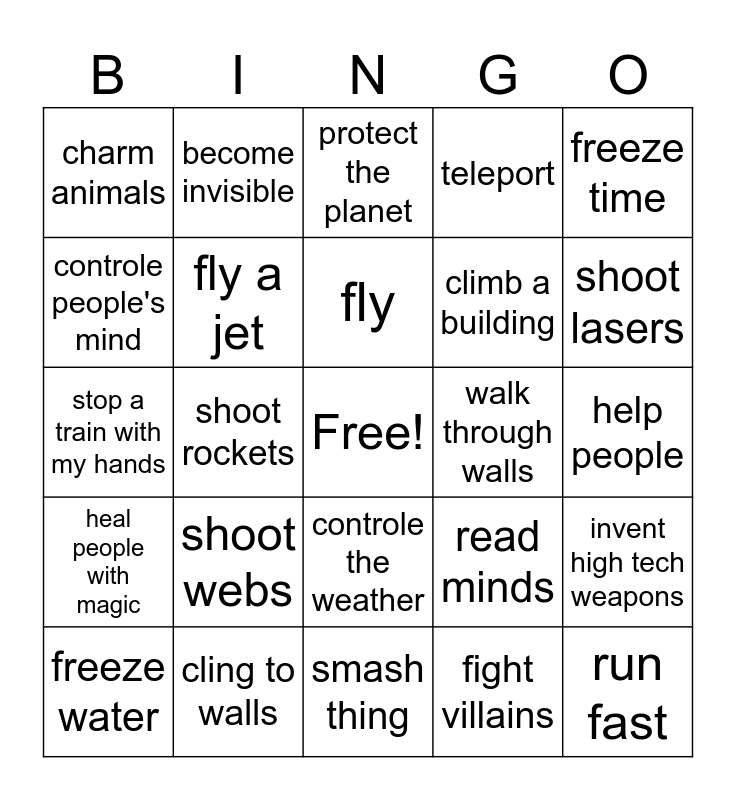 This bingo card has a free space and 24 words: shoot webs, cling to walls, fly, freeze water, freeze time, charm animals, controle people's mind, become invisible, walk through walls, controle the weather, climb a building, stop a train with my hands, read minds, invent high tech weapons, fly a jet, fight villains, help people, protect the planet, shoot lasers, shoot rockets, run fast, heal people with magic, teleport and smash thing.