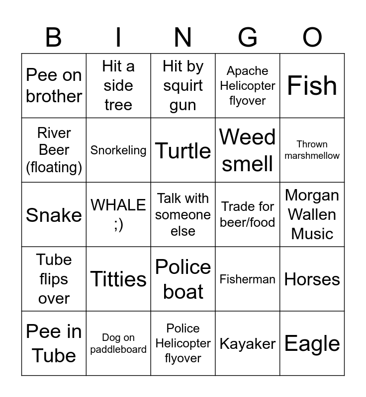 This bingo card has a free space and 24 words: Titties, Dog on paddleboard, Turtle, Pee in Tube, Fish, Pee on brother, River Beer (floating), Hit a side tree, Trade for beer/food, Police boat, Weed smell, Snake, Fisherman, Horses, Snorkeling, Kayaker, Morgan Wallen Music, Hit by squirt gun, Thrown marshmellow, WHALE ;), Eagle, Tube flips over, Apache Helicopter flyover and Police Helicopter flyover.