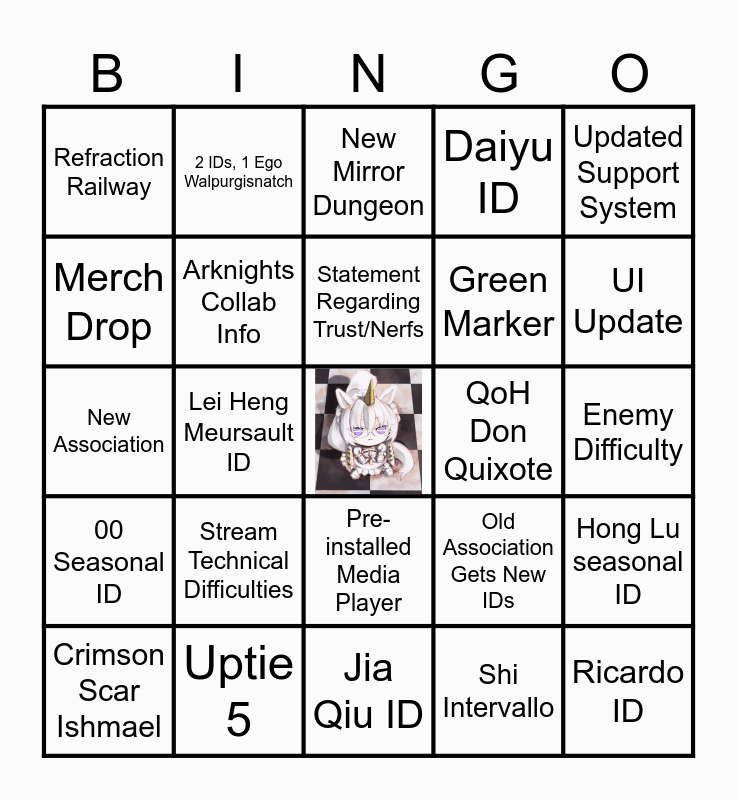 This bingo card has a free space and 28 words: Hong Lu seasonal ID, More Heishou Pack IDs, Green Marker, Shi Intervallo, Merch Drop, New Mirror Dungeon, 2 IDs, 1 Ego Walpurgisnatch, 00 Seasonal ID, QoH Don Quixote, Crimson Scar Ishmael, New Association, Daiyu ID, Uptie 5, Jia Qiu ID, UI Update, More ID Skins Info, Stream Technical Difficulties, Arknights Collab Info, Statement Regarding Trust/Nerfs, Pre-installed Media Player, Refraction Railway, MD Stream, Ricardo ID, Lei Heng Meursault ID, Enemy Difficulty, Old Association Gets New IDs, Updated Support System and Red Hood or Big Bad Wolf ID/Ego.
