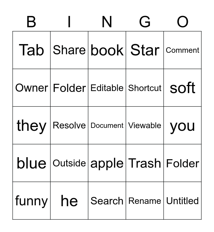 This bingo card has a free space and 49 words: Dog, Untitled, Office, Search, Outside, Private, Share, Invite, Owner, Create, Folder, Star, Folder, Trash, Upload, Open, Editable, Viewable, File, Comment, Resolve, Rename, Tab, Shortcut, dog, soft, funny, green, apple, blue, chair, pencil, we, tall, he, it, she, hat, you, cake, strong, happy, cold, bag, they, book, car, desk and red.