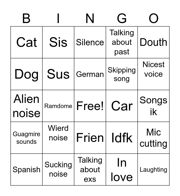 This bingo card has a free space and 24 words: Wierd noise, Sucking noise, German, Spanish, Douth, Cat, Dog, Sis, Car, Frien, Skipping song, Alien noise, Idfk, Mic cutting, Sus, In love, Songs ik, Silence, Nicest voice, Ramdome, Laughting, Guagmire sounds, Talking about past and Talking about exs.