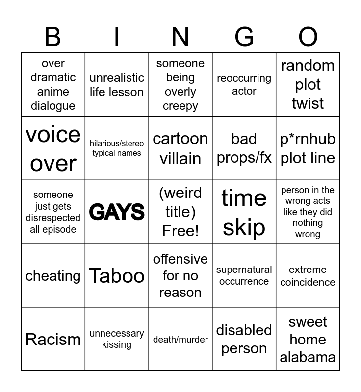 This bingo card has a free space and 24 words: Taboo, unnecessary kissing, cartoon villain, Racism, random plot twist, over dramatic anime dialogue, voice over, unrealistic life lesson, time skip, offensive for no reason, bad props/fx, someone just gets disrespected all episode, supernatural occurrence, extreme coincidence, hilarious/stereo typical names, disabled person, person in the wrong acts like they did nothing wrong, someone being overly creepy, p*rnhub plot line, GAYS, sweet home alabama, cheating, reoccurring actor and death/murder.
