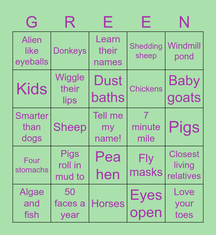 This bingo card has a free space and 24 words: Pigs roll in mud to, 50 faces a year, Dust baths, Algae and fish, Windmill pond, Alien like eyeballs, Kids, Donkeys, 7 minute mile, Pea hen, Chickens, Smarter than dogs, Fly masks, Closest living relatives, Wiggle their lips, Eyes open, Pigs, Learn their names, Baby goats, Sheep, Love your toes, Four stomachs, Shedding sheep and Horses.