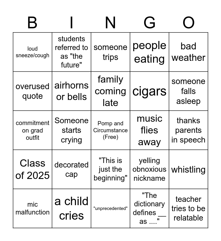 This bingo card has a free space and 29 words: mic malfunction, Mispronounced name, Someone starts crying, long speech, loud sneeze/cough, someone trips, airhorns or bells, decorated cap, music flies away, a child cries, thanks parents in speech, teacher tries to be relatable, "unprecedented", "The dictionary defines __ as ....", someone falls asleep, visibly emotional during a speech, "This is just the beginning", Class of 2025, bad weather, commitment on grad outfit, yelling obnoxious nickname, cheers so loud it drowns out the next name, cigars, overused quote, people eating, students referred to as "the future", whistling, family coming late and someone running.