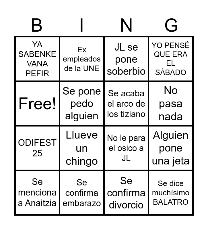 This bingo card has 16 words: Se confirma embarazo, Alguien pone una jeta, JL se pone soberbio, YA SABENKE VANA PEFIR, ODIFEST 25, Ex empleados de la UNE, No le para el osico a JL, Se confirma divorcio, Free!, Se pone pedo alguien, Se menciona a Anaitzia, YO PENSÉ QUE ERA EL SÁBADO, Llueve un chingo, No pasa nada, Se acaba el arco de los tiziano and Se dice muchísimo BALATRO.