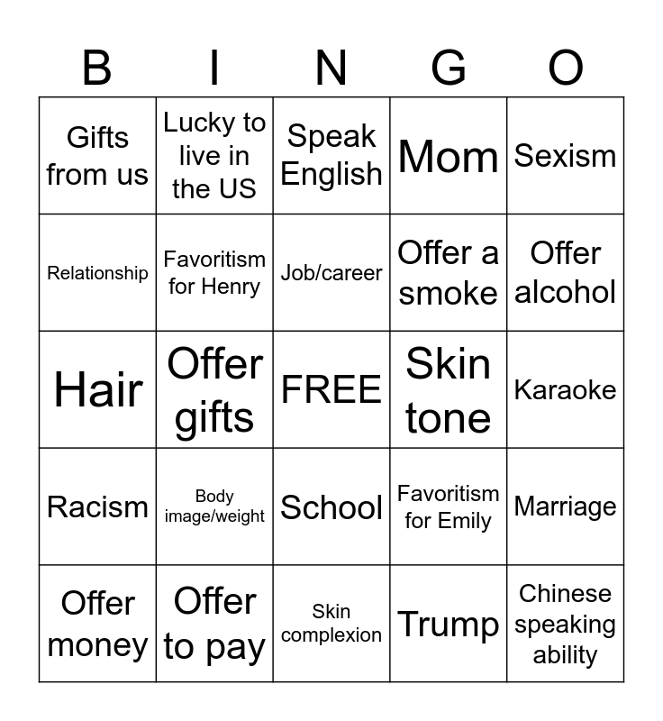 This bingo card has a free space and 24 words: Body image/weight, Offer to pay, Job/career, Offer money, Sexism, Gifts from us, Relationship, Lucky to live in the US, Skin tone, School, Offer a smoke, Hair, Favoritism for Emily, Marriage, Favoritism for Henry, Trump, Karaoke, Speak English, Offer alcohol, Offer gifts, Chinese speaking ability, Racism, Mom and Skin complexion.