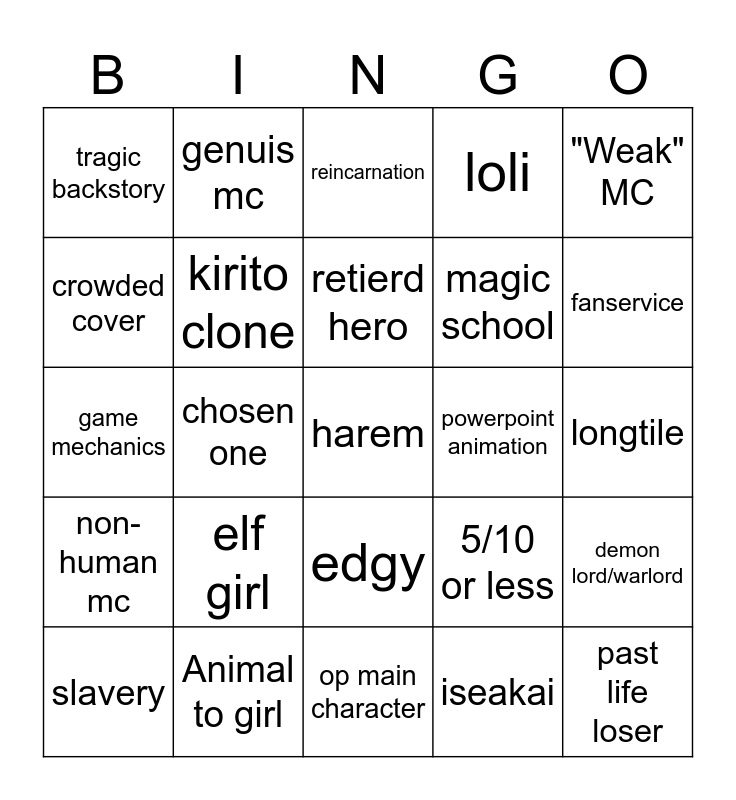 This bingo card has a free space and 24 words: elf girl, Animal to girl, retierd hero, slavery, "Weak" MC, tragic backstory, crowded cover, genuis mc, powerpoint animation, edgy, magic school, game mechanics, 5/10 or less, demon lord/warlord, kirito clone, iseakai, longtile, reincarnation, fanservice, chosen one, past life loser, non-human mc, loli and op main character.