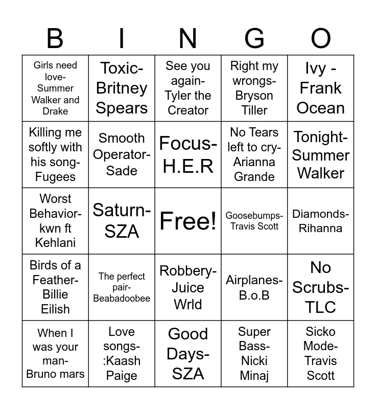 This bingo card has a free space and 24 words: The perfect pair- Beabadoobee, Love songs- :Kaash Paige, Focus- H.E.R, When I was your man- Bruno mars, Ivy -Frank Ocean, Girls need love- Summer Walker and Drake, Killing me softly with his song- Fugees, Toxic- Britney Spears, Goosebumps- Travis Scott, Robbery- Juice Wrld, No Tears left to cry- Arianna Grande, Worst Behavior- kwn ft Kehlani, Airplanes- B.o.B, No Scrubs- TLC, Smooth Operator- Sade, Super Bass- Nicki Minaj, Diamonds- Rihanna, See you again- Tyler the Creator, Tonight- Summer Walker, Saturn- SZA, Sicko Mode- Travis Scott, Birds of a Feather- Billie Eilish, Right my wrongs- Bryson Tiller and Good Days- SZA.