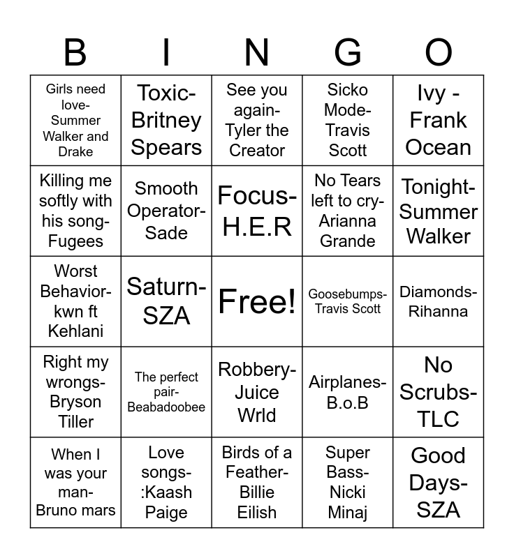This bingo card has a free space and 24 words: The perfect pair- Beabadoobee, Love songs- :Kaash Paige, Focus- H.E.R, When I was your man- Bruno mars, Ivy -Frank Ocean, Girls need love- Summer Walker and Drake, Killing me softly with his song- Fugees, Toxic- Britney Spears, Goosebumps- Travis Scott, Robbery- Juice Wrld, No Tears left to cry- Arianna Grande, Worst Behavior- kwn ft Kehlani, Airplanes- B.o.B, No Scrubs- TLC, Smooth Operator- Sade, Super Bass- Nicki Minaj, Diamonds- Rihanna, See you again- Tyler the Creator, Tonight- Summer Walker, Saturn- SZA, Good Days- SZA, Right my wrongs- Bryson Tiller, Sicko Mode- Travis Scott and Birds of a Feather- Billie Eilish.