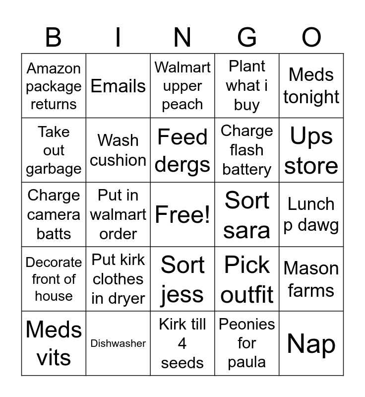 This bingo card has a free space and 24 words: Put kirk clothes in dryer, Dishwasher, Feed dergs, Meds vits, Meds tonight, Amazon package returns, Take out garbage, Emails, Sort sara, Sort jess, Charge flash battery, Charge camera batts, Pick outfit, Mason farms, Wash cushion, Peonies for paula, Lunch p dawg, Walmart upper peach, Ups store, Put in walmart order, Nap, Decorate front of house, Plant what i buy and Kirk till 4 seeds.
