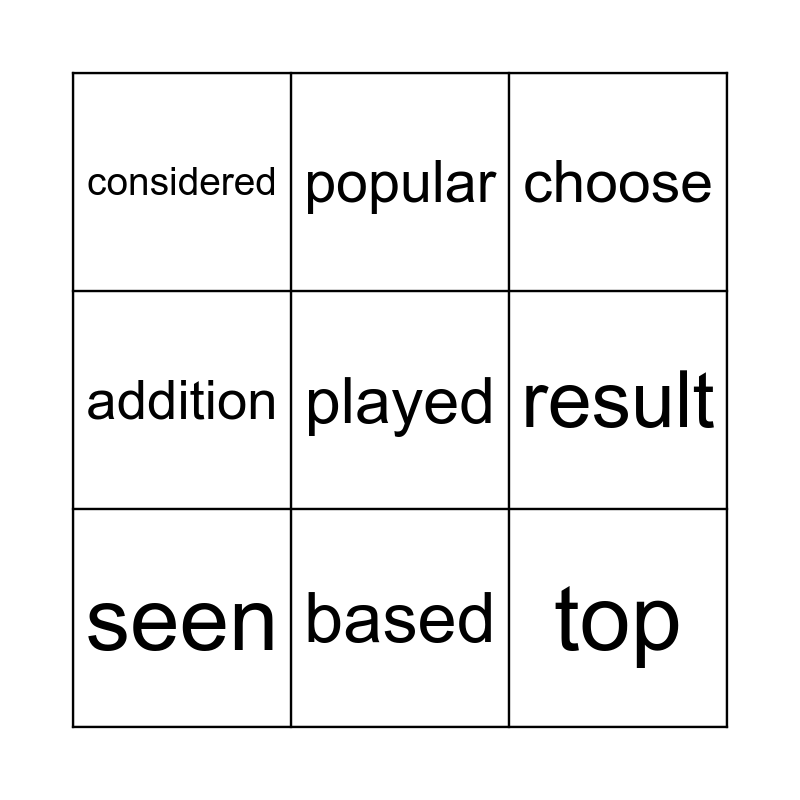 This bingo card has 9 words: seen, played, choose, considered, popular, result, addition, based and top.