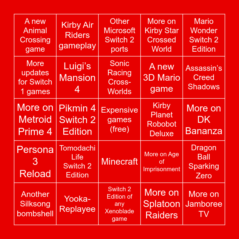 This bingo card has a free space and 24 words: Tomodachi Life Switch 2 Edition, Yooka-Replayee, Sonic Racing Cross-Worlds, Another Silksong bombshell, Mario Wonder Switch 2 Edition, A new Animal Crossing game, More updates for Switch 1 games, Kirby Air Riders gameplay, Kirby Planet Robobot Deluxe, Minecraft, A new 3D Mario game, More on Metroid Prime 4, More on Age of Imprisonment, Dragon Ball Sparking Zero, Luigi’s Mansion 4, More on Splatoon Raiders, More on DK Bananza, Other Microsoft Switch 2 ports, Assassin’s Creed Shadows, Pikmin 4 Switch 2 Edition, More on Jamboree TV, Persona 3 Reload, More on Kirby Star Crossed World and Switch 2 Edition of any Xenoblade game.
