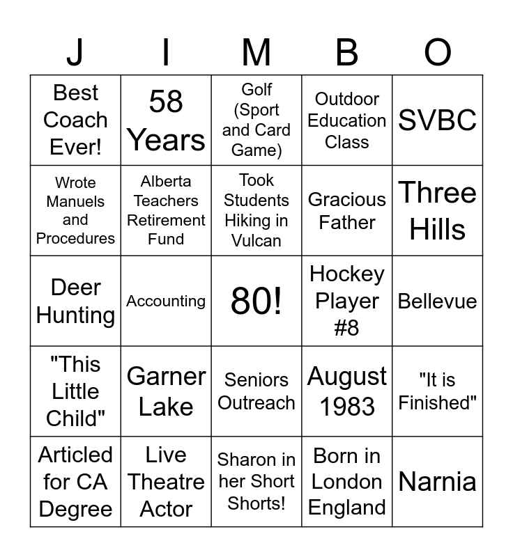 This bingo card has a free space and 24 words: Articled for CA Degree, Garner Lake, Took Students Hiking in Vulcan, Born in London England, SVBC, Best Coach Ever!, 58 Years, Golf (Sport and Card Game), Hockey Player #8, Bellevue, Deer Hunting, Alberta Teachers Retirement Fund, August 1983, "It is Finished", Wrote Manuels and Procedures, Live Theatre Actor, Sharon in her Short Shorts!, Outdoor Education Class, Three Hills, "This Little Child", Accounting, Seniors Outreach, Gracious Father and Narnia.