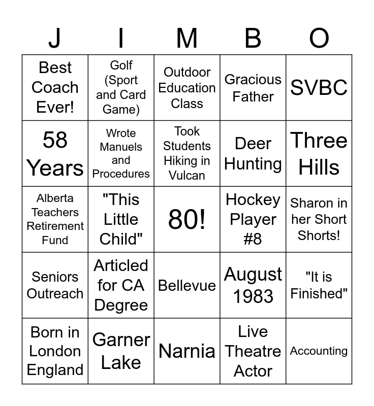This bingo card has a free space and 24 words: Articled for CA Degree, Garner Lake, Took Students Hiking in Vulcan, Born in London England, SVBC, Best Coach Ever!, 58 Years, Golf (Sport and Card Game), Hockey Player #8, Bellevue, Deer Hunting, Alberta Teachers Retirement Fund, August 1983, "It is Finished", Wrote Manuels and Procedures, Live Theatre Actor, Sharon in her Short Shorts!, Outdoor Education Class, Three Hills, "This Little Child", Accounting, Seniors Outreach, Gracious Father and Narnia.