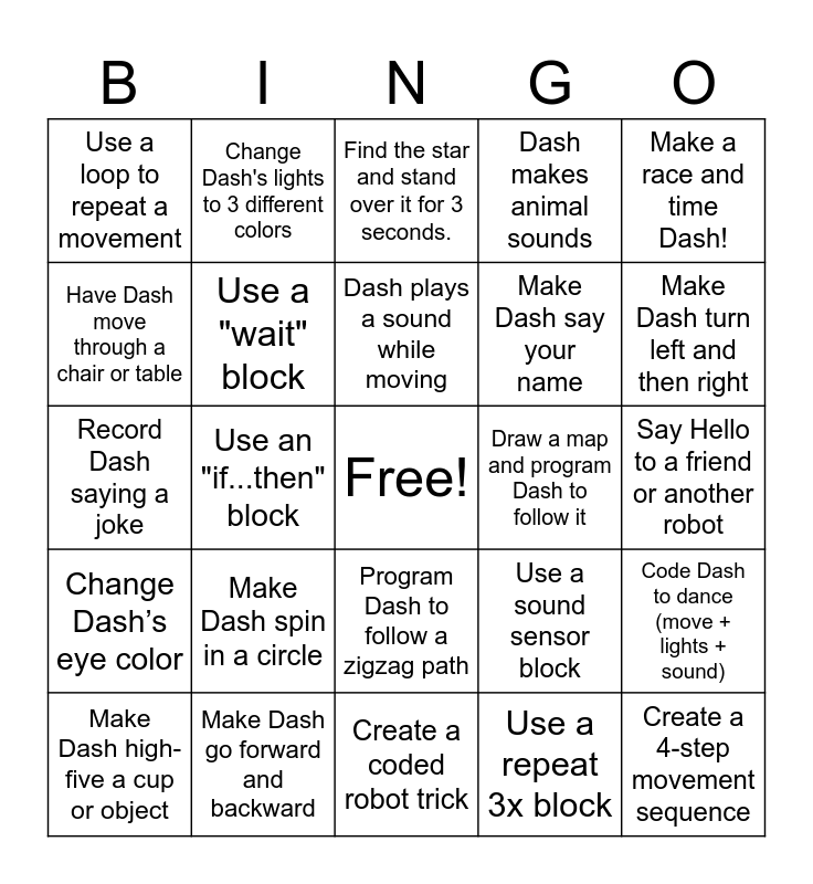 This bingo card has a free space and 24 words: Make Dash spin in a circle, Make Dash go forward and backward, Dash plays a sound while moving, Make Dash high-five a cup or object, Make a race and time Dash!, Use a loop to repeat a movement, Have Dash move through a chair or table, Change Dash's lights to 3 different colors, Draw a map and program Dash to follow it, Program Dash to follow a zigzag path, Make Dash say your name, Record Dash saying a joke, Use a sound sensor block, Code Dash to dance (move + lights + sound), Use a "wait" block, Use a repeat 3x block, Say Hello to a friend or another robot, Find the star and stand over it for 3 seconds., Make Dash turn left and then right, Use an "if...then" block, Create a 4-step movement sequence, Change Dash’s eye color, Dash makes animal sounds and Create a coded robot trick.