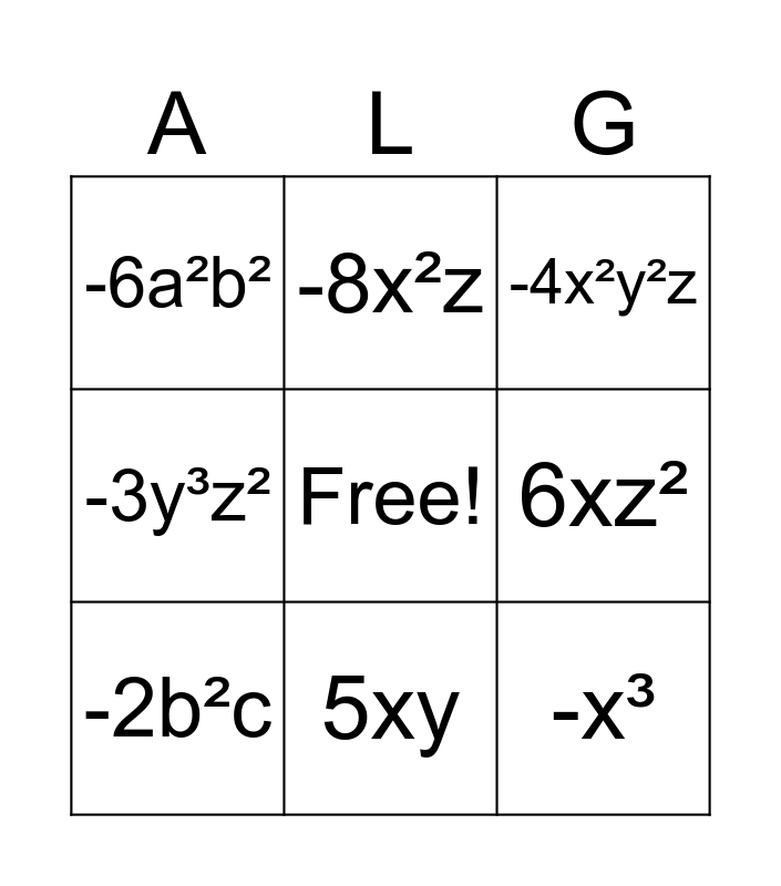 This bingo card has a free space and 30 words: -a³b², -4x²y², ab², -9b³c, -6a²b², -4x²y²z, -2b²c, 2a³b, x²yz, -6p²q³, 10x⁴y, 4x²y³, -7x², -mn²p, -3m²n², -a²b, -3x³y², -abc, 9xyz, -x³, 11m²n, -7a²c², -8x²z, -x²y, 6xz², -3y³z², -6a²b², 3x²y²z, 5xy and 5xy².