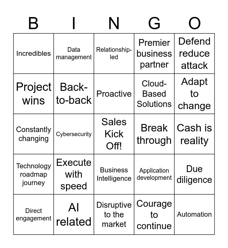 This bingo card has a free space and 25 words: Execute with speed, Disruptive to the market, Proactive, Direct engagement, Defend reduce attack, Incredibles, Project wins, Data management, Break through, Business Intelligence, Cloud-Based Solutions, Constantly changing, Application development, Due diligence, Back-to-back, Staggered Billing, Cash is reality, Relationship-led, Adapt to change, Cybersecurity, Automation, AI related, Technology roadmap journey, Premier business partner and Courage to continue.