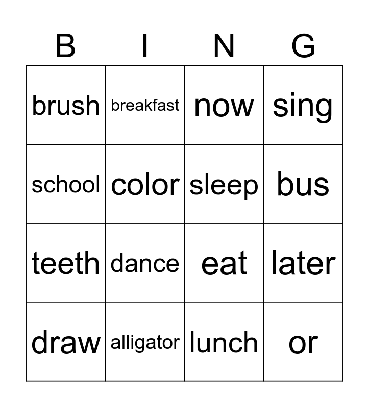 This bingo card has 16 words: alligator, later, now, brush, teeth, breakfast, eat, lunch, school, color, draw, sing, dance, bus, sleep and or.