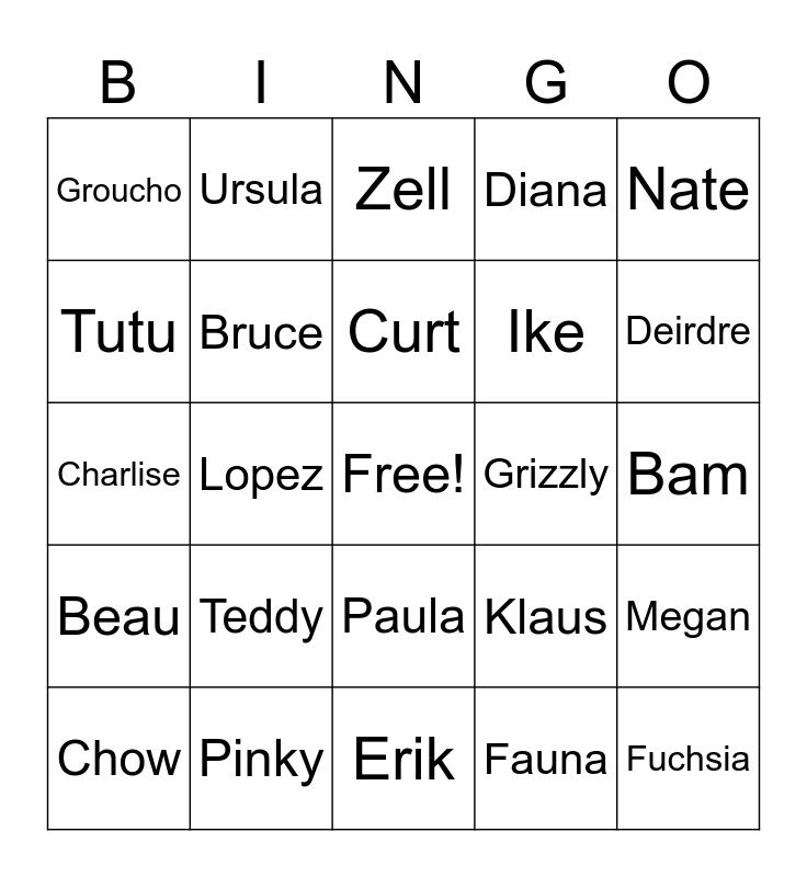 This bingo card has a free space and 24 words: Teddy, Pinky, Curt, Chow, Nate, Groucho, Tutu, Ursula, Grizzly, Paula, Ike, Charlise, Klaus, Megan, Bruce, Fauna, Bam, Zell, Deirdre, Lopez, Fuchsia, Beau, Diana and Erik.