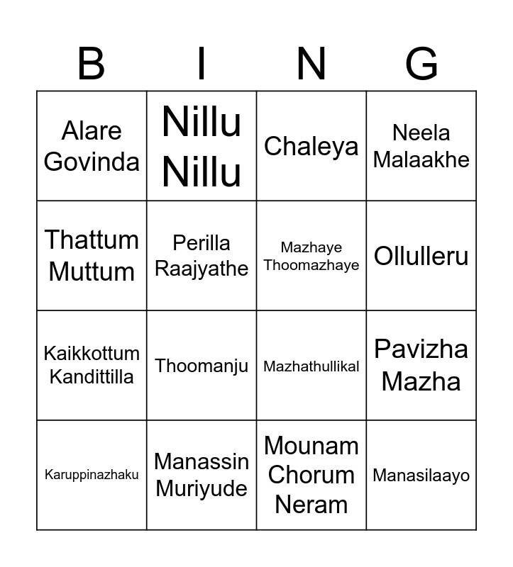 This bingo card has 116 words: Devadoothar Paadi, Eyy Banane, Kiliye, Illuminati, Kanmanipoove, Minnalvala, Neela Malaakhe, Angu Vaana Konilu, Jeevamshamayi, Parayuvaan, Punchiri Thanjum, Uyire, Malare, Puthiyoru Lokam, Poomuthole, Lailakame, Azhalinte Azhangalil, Pichavecha Naal, I Love You Mummy, Etho Mazhayil, Thiruvaavaniraavu, Chaleya, Naacho Naacho, Golden Sparrow, Hey Minnale, Manasilaayo, Dippam Dappam, Mazhakondu Mathram, Thodakkam Mangalyam, Minungum Minnaminuge, Thoomanju, Ollulleru, Pavizha Mazha, Kaana Kuyile, Ponnin Kanikkonna, Njaan Kaanum Neram, Uyiril Thodum, Kizhakkupookkum, Pularikalo, Muthuchippi, Nenjakame, Aaraadhike, Kurumbathi Chundhari, Nenjodu Cherthu, Manamariyunnolu, Neeyilla Neram, Kamini, Perilla Raajyathe, Thattathin Marayathe, Omal Kanmani, Aarum Kaanaathinnen, Manassin Muriyude, Nee Himamazhayayi, Thaniye, Vaathil Melle, Aaranne Aaranne, Akale, Manickyachirakulla, Payye Veesum, Mozhikalum, Puthiyoru Pathayil, Arikathayaaro - Version, 1, Enthanee Mounam, Vaathilil, Minunundae Mullapolae, Aaro Nenjil, Alare, Mazhaye Thoomazhaye, Mazhathullikal, Arikil Pathiye, Mounam Chorum Neram, Anuraaga Vilochananaayi, Ore Nila Ore Veyil, Neeyam Thanalinu, Aaramam Nirangal, Karuppinazhaku, Oru Chik Chik Chik Chik, Alare Govinda, Ole Ole, Kodikayarana Pooramai, Enne Thallendammaava, Nillu Nillu, Ithiri Chakkara Nulli, Kadukittu Varuthuru, Kaikkottum Kandittilla, Jillam Jillala, Kando Ninde Kannil, Kudukku, Kuttanadan, Markazhiye Mallikaye, Ole Melody, Oru Rajamalli, Othorumichoru, Roshomon, Thattum Muttum, Themma Themma Themmadikkatte, Kalyanakacheri, Mundiri Paadam, Chirimanimulle, Johny Mone Johnee, Dhum Dhum Dhum Dhum, Maliniyude Theerangal, Chingamasam, Kettille Kettille, Thakilu Pukilu, Lajjavathiye, Chimmi Chimmi, Karuthappenne, Visile Visile, Kavilinayil, Kokkokko, Appangal, Aaha Manoranjini, Velmuruka, Paavam Paavada and Pazhanimala.