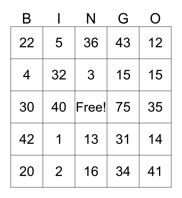 This bingo card has a free space and 24 words: 1, 2, 3, 20, 12, 22, 4, 5, 75, 13, 15, 30, 31, 14, 32, 34, 35, 36, 15, 40, 41, 42, 43 and 16.
