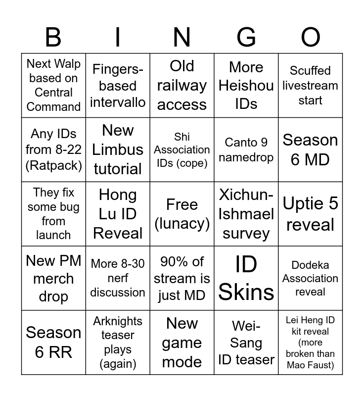 This bingo card has a free space and 24 words: More 8-30 nerf discussion, Arknights teaser plays (again), Shi Association IDs (cope), Season 6 RR, Scuffed livestream start, Next Walp based on Central Command, Any IDs from 8-22 (Ratpack), Fingers-based intervallo, Xichun-Ishmael survey, 90% of stream is just MD, Canto 9 namedrop, They fix some bug from launch, ID Skins, Dodeka Association reveal, New Limbus tutorial, Wei-Sang ID teaser, Uptie 5 reveal, Old railway access, Season 6 MD, Hong Lu ID Reveal, Lei Heng ID kit reveal (more broken than Mao Faust), New PM merch drop, More Heishou IDs and New game mode.