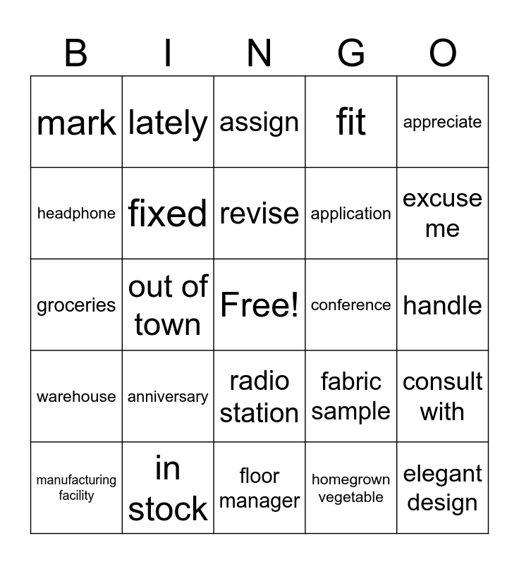 This bingo card has a free space and 36 words: taste, pharmacy, interest rate, fixed, fabric sample, warehouse, revise, peel, appreciate, commuter train, out of town, fit, out of print, conference, excuse me, mark, twentieth, anniversary, elegant design, assign, handle, consult with, in stock, manufacturing facility, floor manager, lately, groceries, résumé, application, headphone, as long as, seasonal, homegrown vegetable, radio station, bureau and announcement.
