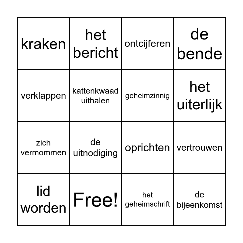 This bingo card has 21 words: Free!, bespioneren, het bericht, de code, het geheimschrift, geheimzinnig, kraken, ontcijferen, oprichten, het uiterlijk, zich vermommen, de bende, de bijeenkomst, buitensluiten, kattenkwaad uithalen, de leden, lid worden, de uitnodiging, verklappen, vertrouwen and voor je houden.