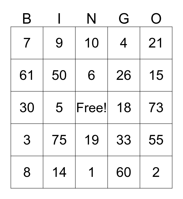 This bingo card has a free space and 24 words: 75, 14, 6, 8, 21, 7, 61, 9, 18, 19, 26, 30, 33, 55, 50, 60, 73, 10, 15, 5, 2, 3, 4 and 1.