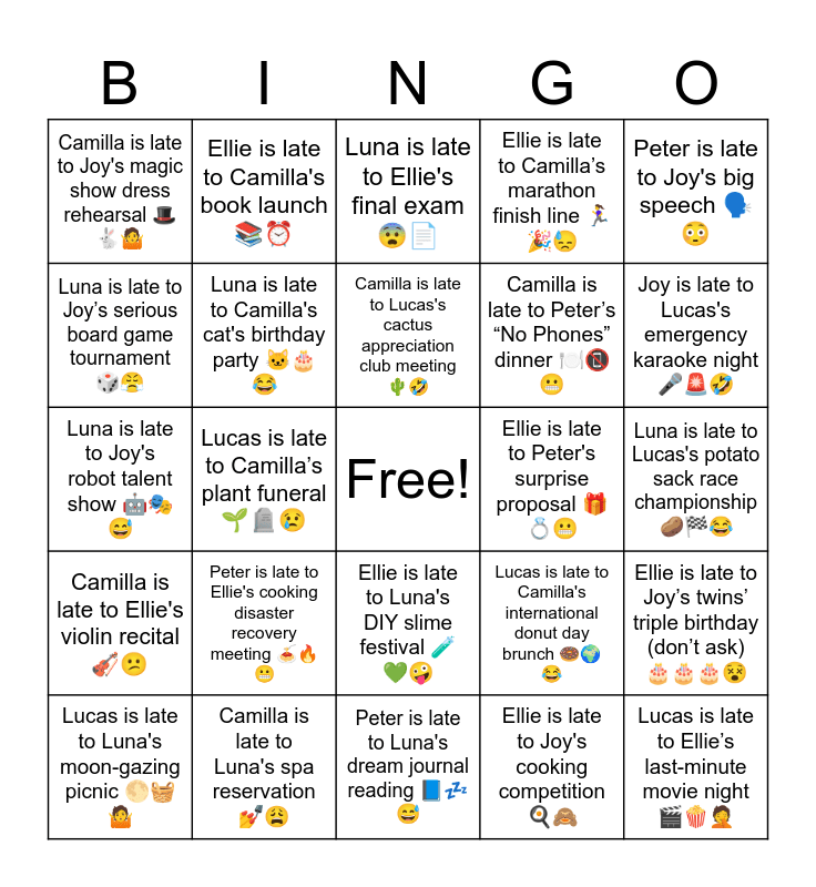 This bingo card has a free space and 34 words: Peter is late to Lucas's graduation party ๐๐ , Ellie is late to Joy's cooking competition ๐ณ๐, Lucas is late to Peter's dog's wedding ๐ฌ๐, Joy is late to Luna's surprise birthday party ๐๐คซ, Camilla is late to Ellie's violin recital ๐ป๐, Luna is late to Camilla's cat's birthday party ๐ฑ๐๐, Peter is late to Joy's big speech ๐ฃ๏ธ๐ณ, Lucas is late to Luna's moon-gazing picnic ๐๐งบ๐คท, Ellie is late to Camilla's book launch ๐โฐ, Joy is late to Peter's award ceremony ๐๐ฌ, Camilla is late to Lucas's cactus appreciation club meeting ๐ต๐คฃ, Luna is late to Ellie's final exam ๐จ๐, Peter is late to Camilla's online Zoom concert ๐ป๐ถ๐ , Lucas is late to Joy's dance battle ๐๐บ๐, Ellie is late to Peter's surprise proposal ๐๐๐ฌ, Joy is late to Lucas's emergency karaoke night ๐ค๐จ๐คฃ, Camilla is late to Luna's spa reservation ๐ ๐ฉ, Luna is late to Joy's robot talent show ๐ค๐ญ๐ , Peter is late to Ellie's cooking disaster recovery meeting ๐๐ฅ๐ฌ, Lucas is late to Camilla's international donut day brunch ๐ฉ๐๐, Ellie is late to Luna's DIY slime festival ๐งช๐๐คช, Joy is late to Peter's haunted house walkthrough ๐ป๐ฑ, Camilla is late to Joy's magic show dress rehearsal ๐ฉ๐๐คท, Luna is late to Lucas's potato sack race championship ๐ฅ๐๐, Peter is late to Luna's dream journal reading ๐๐ค๐ , Lucas is late to Ellieโs last-minute movie night ๐ฌ๐ฟ๐คฆ, Ellie is late to Camillaโs marathon finish line ๐โโ๏ธ๐๐, Joy is late to Lunaโs dogโs wedding ๐ถ๐๐, Camilla is late to Peterโs โNo Phonesโ dinner ๐ฝ๏ธ๐ต๐ฌ, Luna is late to Joyโs serious board game tournament ๐ฒ๐ค, Peter is late to Ellieโs emergency cupcake tasting ๐ฐ๐จ๐คฃ, Lucas is late to Camillaโs plant funeral ๐ฑ๐ชฆ๐ข, Ellie is late to Joyโs twinsโ triple birthday (donโt ask) ๐๐๐๐ต and Joy is late to Peterโs live TV interview ๐ฅ๐บ๐ฌ.